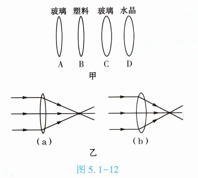 8. (★★★)某物理学习小组,选择如图5.1-12甲所示的四个透镜进行探究实验(其中A、B和C、D是两组形状分别相同的凸透镜,它们分别用玻璃、塑料和水晶制作而成)。
