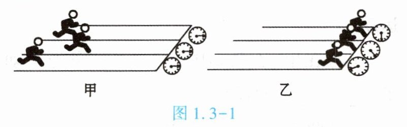 1. ($\star\star$)日常生活中我们常用两种方法来比较物体运动的快慢,请借助图 1.3 - 1 中的短跑比赛来说明这两种方法:图甲表明______;图乙表明______。