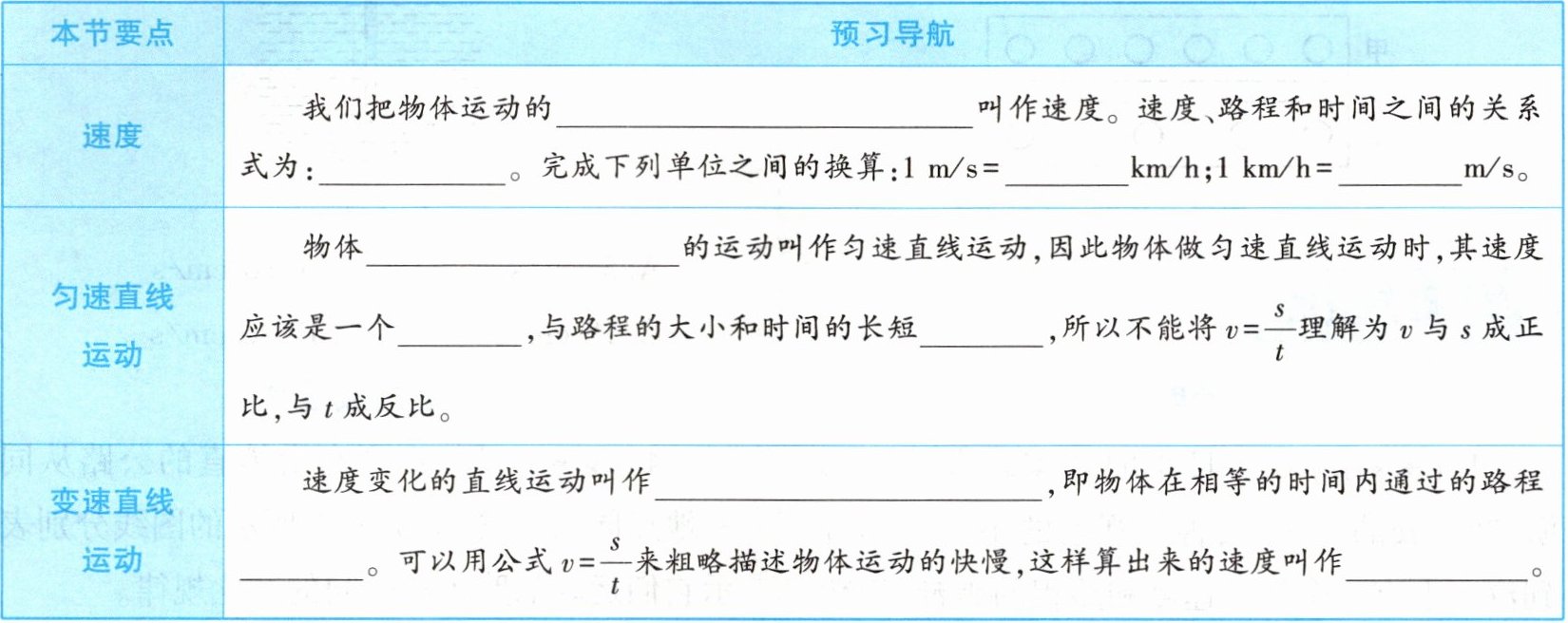 |速度|我们把物体运动的______叫作速度。速度、路程和时间之间的关系式为:______。完成下列单位之间的换算:$1m/s= $______$km/h$;$1km/h= $______$m/s$。|