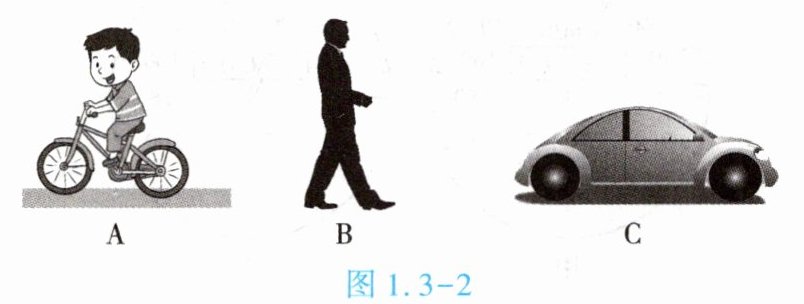 3. ($\star\star$)如图 1.3 - 2 所示,______的速度约为$1.2m/s$,______的速度约为$30m/s$,______的速度约为$4m/s$。(填“A”“B”或“C”)