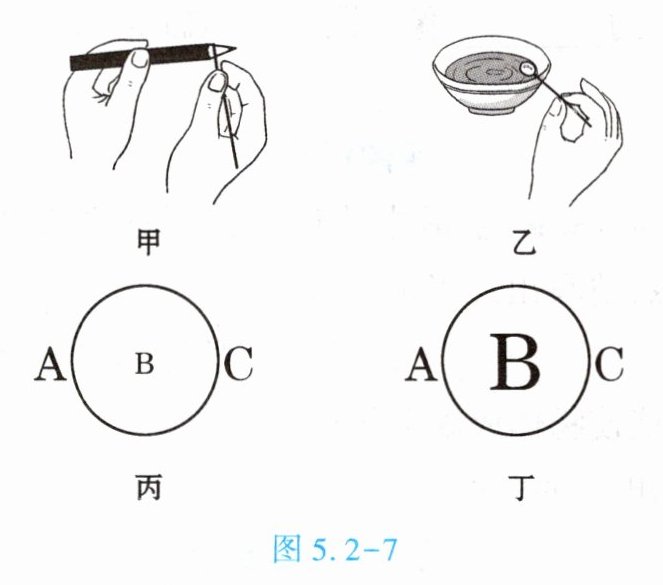 8. (★★★)小明学习了放大镜的知识后回家做了下述实验:用金属丝在铅笔尖上绕一圈拧紧,取下金属丝制成的小圆环,将金属环浸入水里,平着慢慢取出,环内水呈凹面(如图5.2 - 7甲、乙),用它看报纸,报纸上的字变小了(如图5.2 - 7丙);慢慢向环内滴水,直至水面凸起,再用它看报纸上的字,字变大了(如图5.2 - 7丁)。你能分析产生上述两种现象的原因吗?请你动手做一下这个实验,然后对它进行分析。
