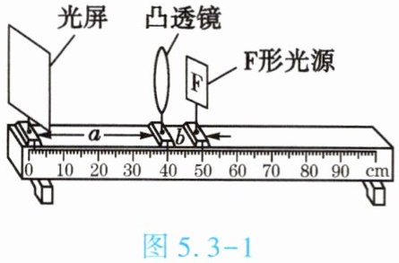 3. (★★)探究发光物体通过焦距为12cm的凸透镜成像的规律时,F形光源、透镜、光屏位置如图5.3 - 1所示,此时【 】
