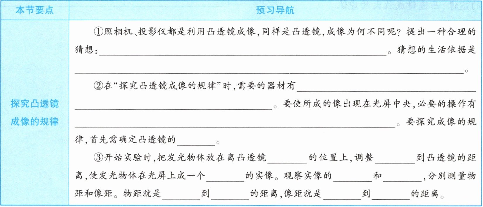|探究凸透镜成像的规律|①照相机、投影仪都是利用凸透镜成像,同样是凸透镜,成像为何不同呢?提出一种合理的猜想:______。猜想的生活依据是______。②在“探究凸透镜成像的规律”时,需要的器材有______。要使所成的像出现在光屏中央,必要的操作有______。要探究成像的规律,首先需确定凸透镜的______。③开始实验时,把发光物体放在离凸透镜______的位置上,调整______到凸透镜的距离,使发光物体在光屏上成一个______的实像。观察实像的______和______,分别测量物距和像距。物距就是______到______的距离,像距就是______到______的距离。|