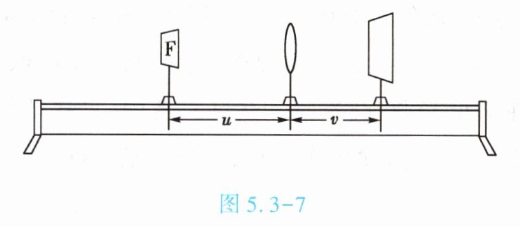 4. (★★★)(双选)小明利用如图5.3 - 7所示的装置“探究凸透镜成像的规律”。将F形光源放在凸透镜左侧适当位置,调整光屏到凸透镜的距离,使F形光源在光屏上成清晰的像,分别测出物距u和像距v,实验数据如下表。