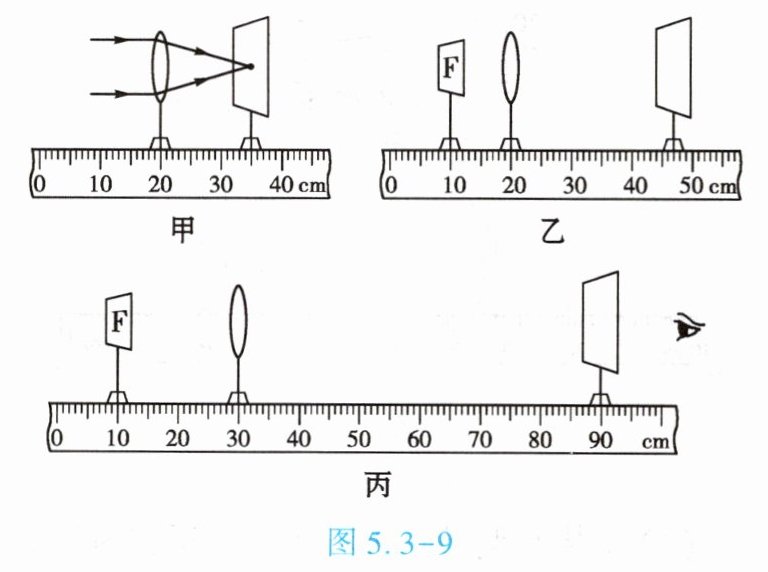 (4)在图5.3 - 9丙中,保持凸透镜的位置不变,如果F形光源向左移动5cm,为了在光屏上得到一个清晰的像,光屏应该向______(填“左”或“右”)移动。