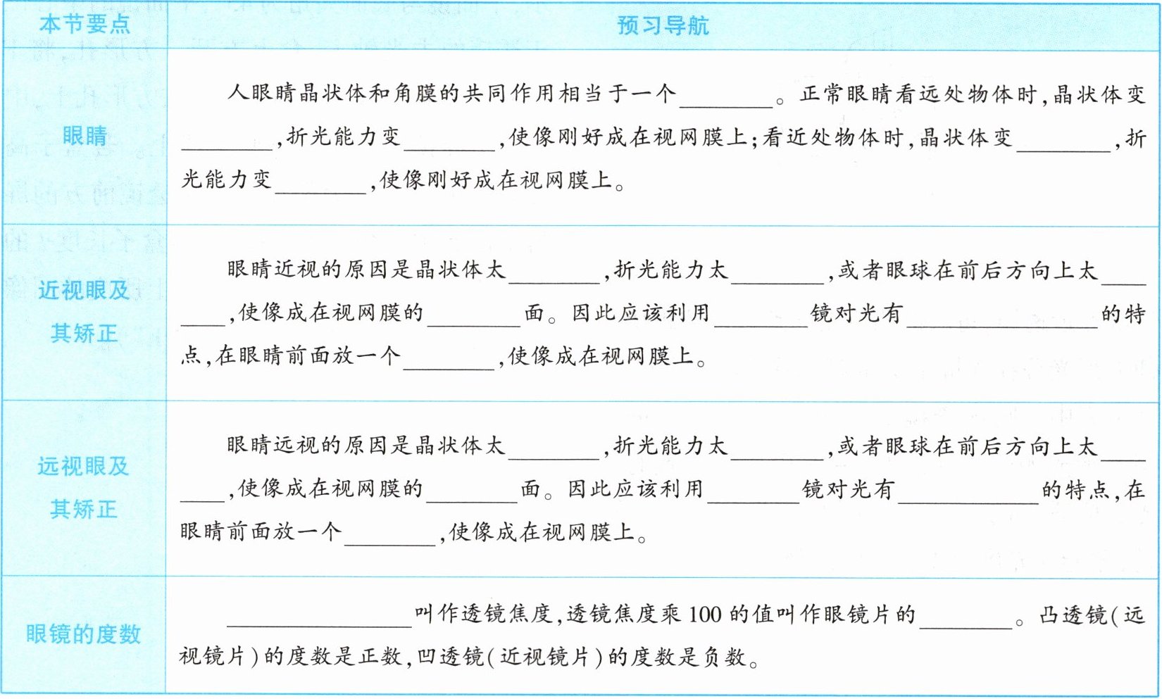 |眼镜的度数|______叫作透镜焦度,透镜焦度乘100的值叫作眼镜片的______。凸透镜(远视镜片)的度数是正数,凹透镜(近视镜片)的度数是负数。|