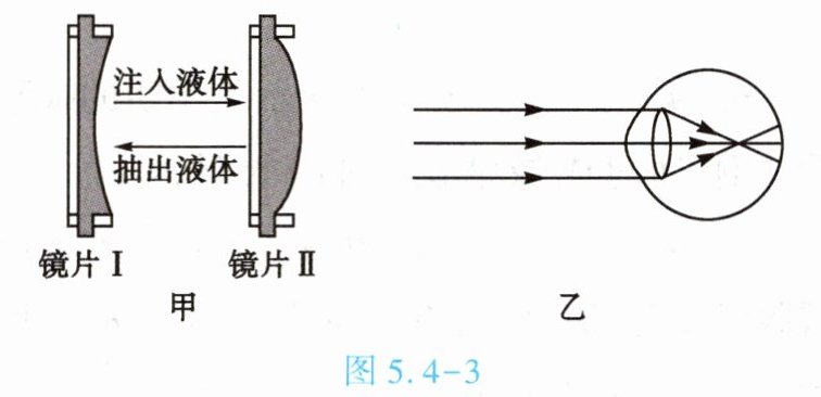 2. (★★)为满足特殊人群的需求,有一种眼镜的镜片厚薄可以改变,如图5.4-3甲所示,通过在透明的薄膜中注入或抽出光学液体来实现镜片厚薄的改变。图5.4-3乙是某人看远处物体时的成像情况,此时该人的视力缺陷是______(填“近视眼”或“远视眼”),矫正时应选择镜片______(填“Ⅰ”或“Ⅱ”)。