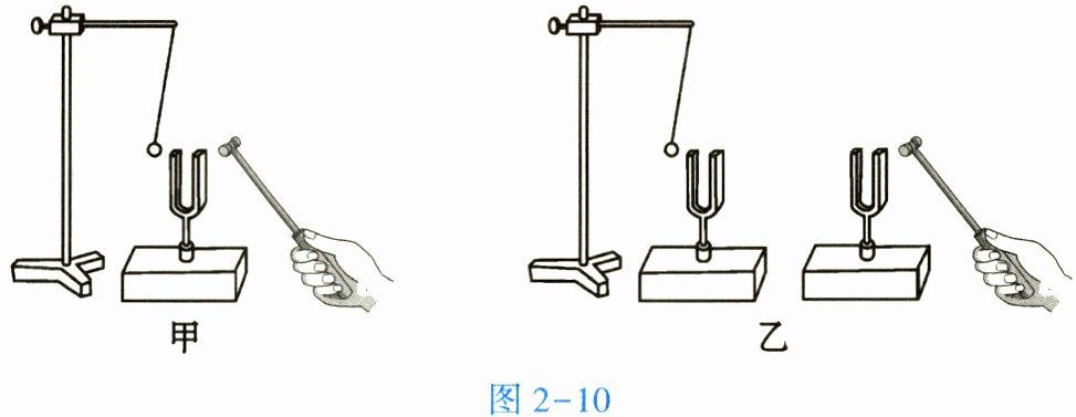 (2)如图2-10乙所示,用橡皮锤敲击右边的音叉,左边的音叉也能发声,并把小球弹起。该实验能说明:声音是由物体振动产生的,声音可在______中传播,声波可以传递______。若在月球上做这个实验,左边的音叉______(填“会”或“不会”)发声,原因是______。