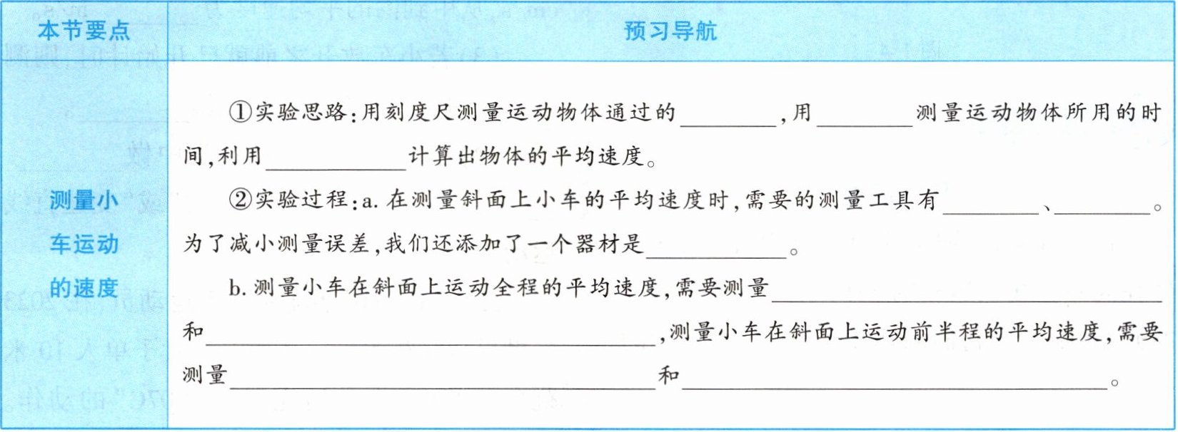 |测量小车运动的速度|①实验思路:用刻度尺测量运动物体通过的____,用____测量运动物体所用的时间,利用____计算出物体的平均速度。②实验过程:a. 在测量斜面上小车的平均速度时,需要的测量工具有____、____。为了减小测量误差,我们还添加了一个器材是____。b. 测量小车在斜面上运动全程的平均速度,需要测量____和____,测量小车在斜面上运动前半程的平均速度,需要测量____和____。|