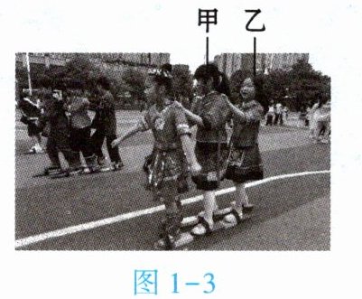 4. (★★)学校的趣味运动会丰富多彩,其中“三人板鞋”竞速项目深受大家喜爱。如图1 - 3所示,甲、乙、丙三位同学正在进行“三人板鞋”竞速活动,如果说甲同学是静止的,所选的参照物是【 】
