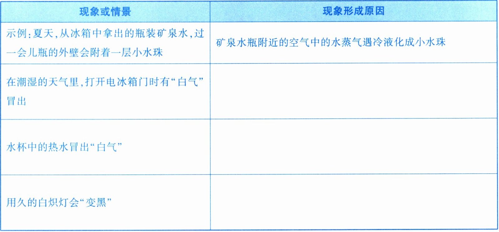 |示例:夏天,从冰箱中拿出的瓶装矿泉水,过一会儿瓶的外壁会附着一层小水珠|矿泉水瓶附近的空气中的水蒸气遇冷液化成小水珠|