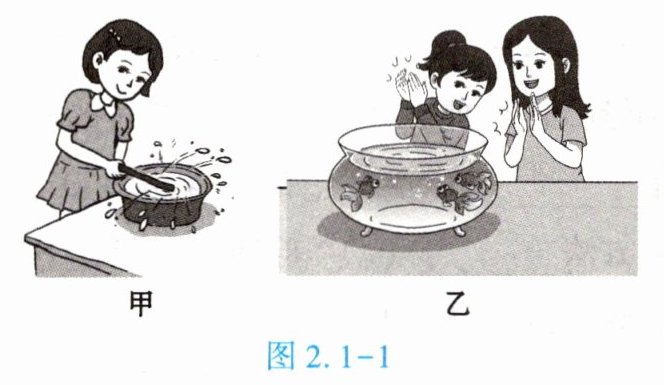 1. (★★)如图2.1 - 1甲所示,敲响的音叉接触水面能溅起水花,说明声音是由于物体的____产生的;如图2.1 - 1乙所示,鱼儿能听见拍手声,说明____可以传播声音。