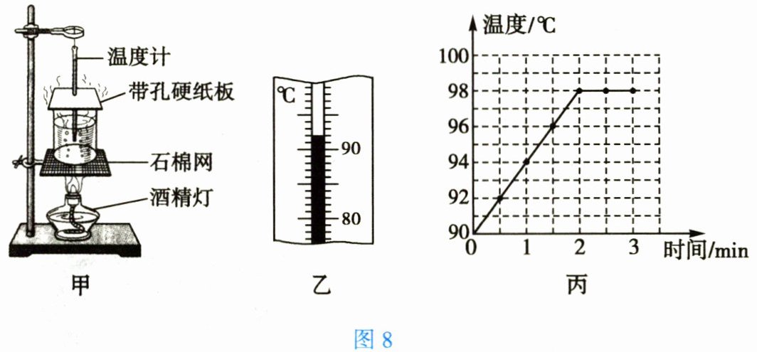 (2)实验中某时刻温度计的示数如图8乙,为______℃。根据实验数据绘制的水的温度随加热时间变化的图像如图8丙,由图可知本实验中水的沸点为______℃。