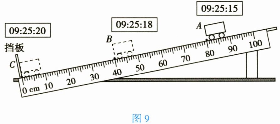 18. 如图9所示是“测量小车的平均速度”的实验装置。实验时让小车从斜面的A点由静止滑下,分别测出小车到达B点和C点的时间,即可求出不同路段的平均速度。