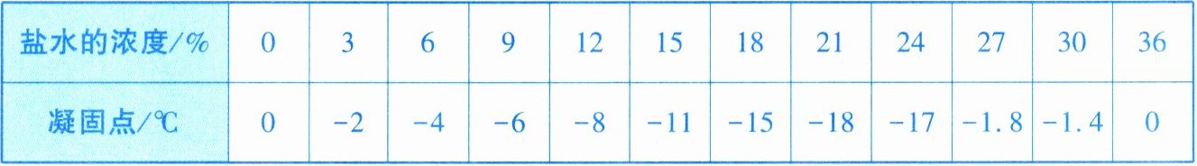 分析表格中数据可知,当盐水浓度增大时,其凝固点______。