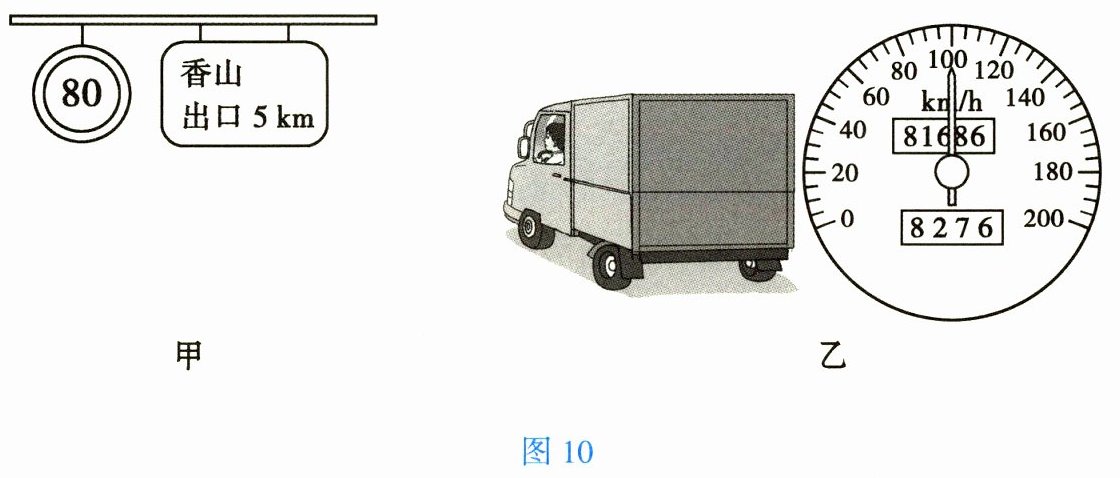 20. 小李开车时看到如图10甲所示的交通标志牌,此时汽车内的速度表如图10乙所示。