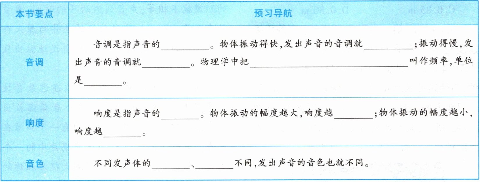 |音调|音调是指声音的____。物体振动得快,发出声音的音调就____;振动得慢,发出声音的音调就____。物理学中把____叫作频率,单位是____。|
