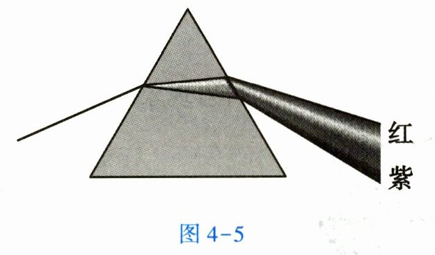 6. 彩虹是太阳光传播过程中被空气中的水滴______而产生的。这个现象可以由太阳光通过玻璃三棱镜的实验来解释。由图 4 - 5 可知,通过三棱镜时红光的偏折程度比紫光要______(填“大”或“小”)。
