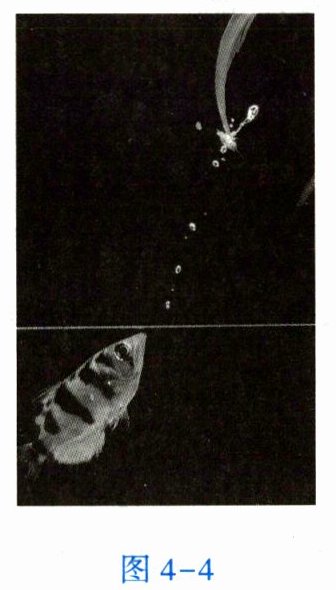 5. 图 4 - 4 是射水鱼在水中准确射中水面上 1 m 远的小昆虫的照片。请你利用所学的光学知识分析,水中的鱼看到小昆虫的位置是在实际昆虫所在位置的______(填“上方”或“下方”),这是由光的______造成的。