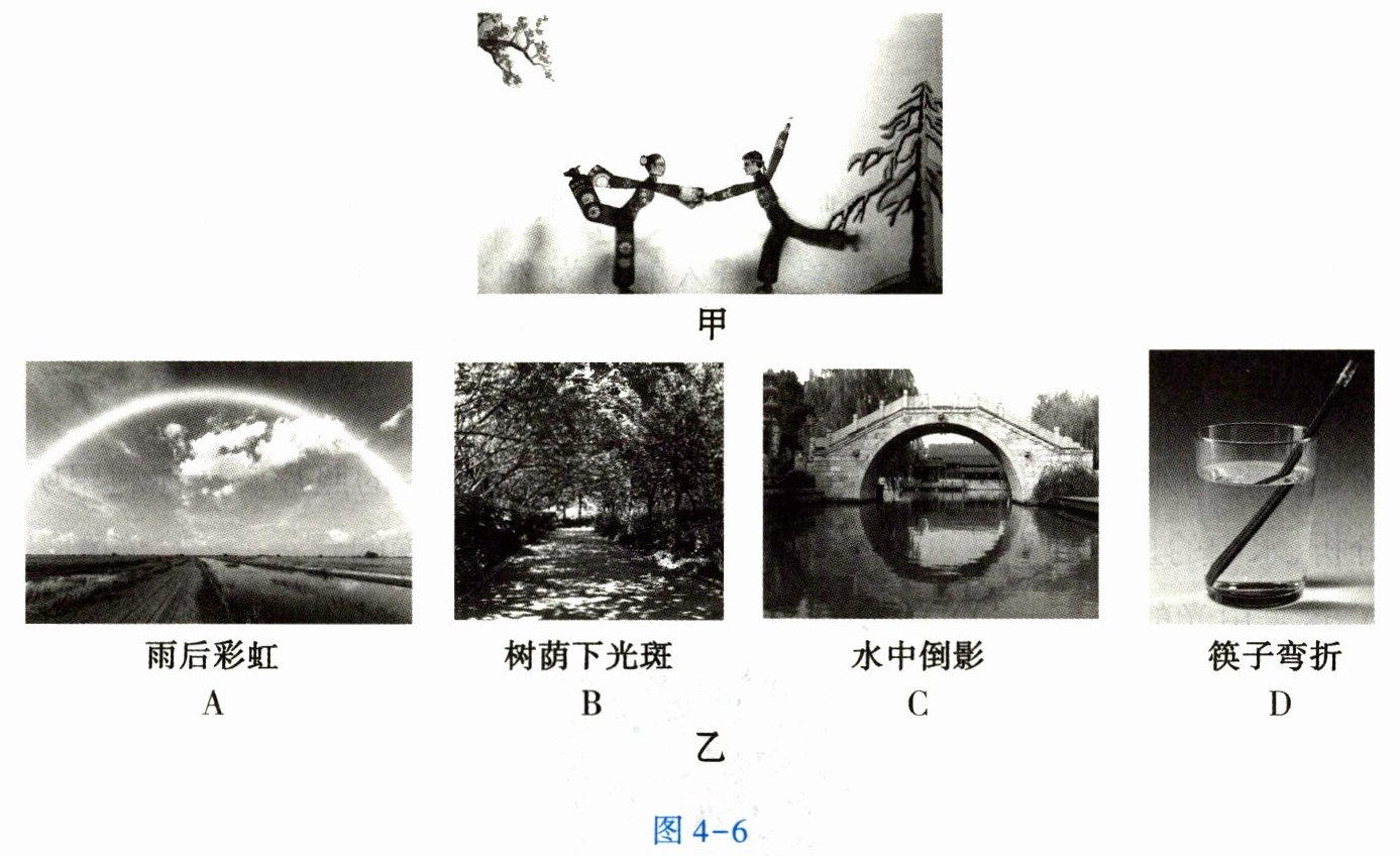 7. 北京冬奥会期间,北京皮影艺术剧院紧扣冬奥题材,精彩呈现皮影戏《寻找雪姑娘》,如图 4 - 6 甲所示。图 4 - 6 乙中,与皮影戏原理相同的是【 】