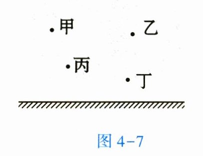 8. 舞蹈教室内有一面非常大的平面镜,一位同学先后站在镜前甲、乙、丙、丁四个位置,如图 4 - 7 所示。关于他在平面镜中所成像的特点,下列描述中正确的是【 】