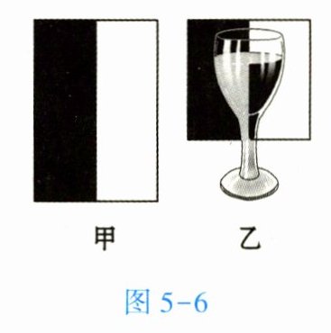 8. 将如图 5 - 6 甲所示的黑白卡片放在一只未装满水的薄高脚玻璃杯后面,在高脚杯前方观察到的现象如图 5 - 6 乙所示,此时装水部分的高脚杯和杯内水的组合相当于一个【 】