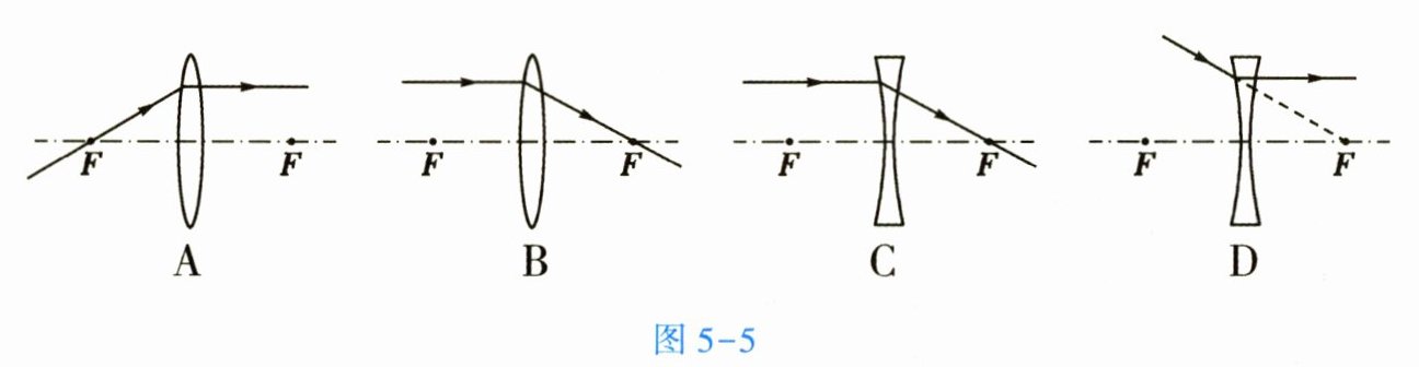 7. 图 5 - 5 是小明同学画的一条通过凸透镜或凹透镜后折射的光线光路图,其中错误的是【 】