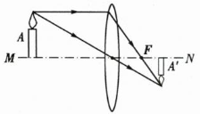 17. 如图 5 - 13 所示,$MN$为凸透镜的主光轴,$A$为蜡烛,$A'$为蜡烛在光屏上所成的像,根据凸透镜成像原理确定凸透镜的位置及焦点,并将它们画出来。