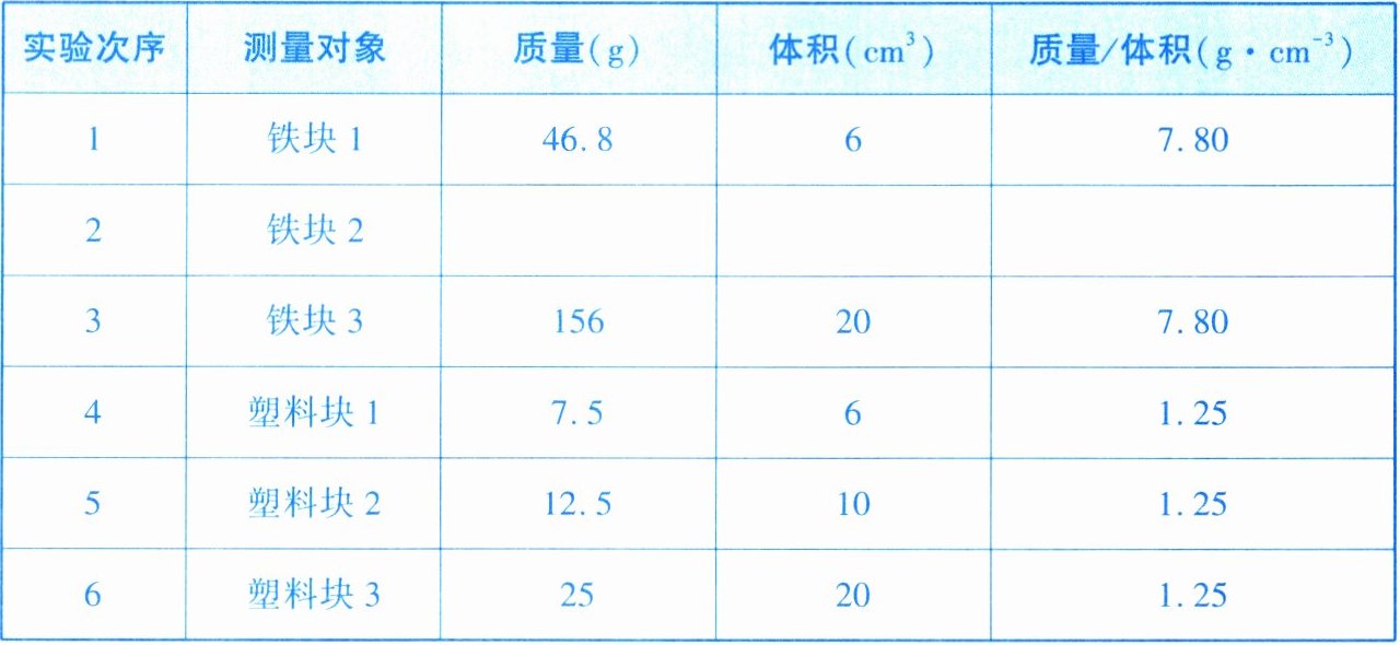 |实验次序|测量对象|质量(g)|体积$(cm^3)$|质量/体积$(g·cm⁻^3)$|
