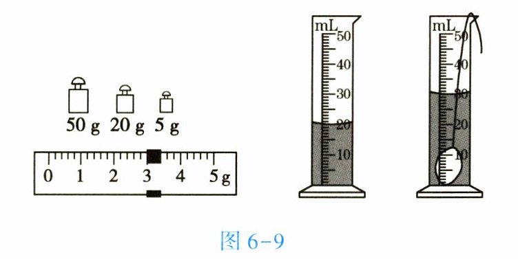 17. 在探究“物体的质量与体积之间的关系”时,小明同学把收集到的数据填入下表。但他漏填了第二次测量的质量和体积,其质量和体积的读数如图6-9所示,请你帮他完成下表。