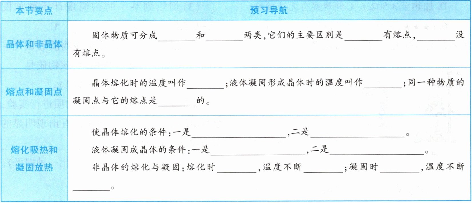 |熔化吸热和凝固放热|使晶体熔化的条件:一是______,二是______。液体凝固成晶体的条件:一是______,二是______。非晶体的熔化与凝固:熔化时______,温度不断______;凝固时______,温度不断______。|