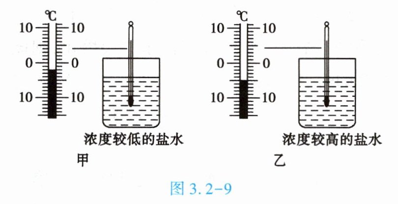 8. (★★★)(2023·长沙改编)环卫工人往结冰的桥面撒盐加快冰的熔化,激发了小明探究盐水凝固点的兴趣。他把两杯浓度不同的盐水放入冰箱冷冻室里,当杯内的盐水中出现冰块时测量它们的温度,温度计的示数如图 3.2 - 9 所示(每支温度计的单位都是摄氏度),图乙中温度计的示数为______℃。从实验现象可知,盐水的浓度越高,其凝固点越______。经过认真思考,小明得出盐水凝固时需要______热量,而环卫工人在冰雪路面上撒盐是为了让冰盐混合物的熔点______环境温度,这样冰才能______热量,尽快熔化。