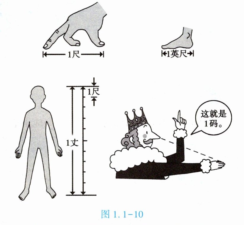 古代人度量是以人的某一部位作计量标准的,比如:将拇指和中指张开按在要求度量的物体上,就是古代的1尺;在英语中,“英尺”和“脚”是同一个词,查理大帝就曾郑重地宣布,1英尺就是他的脚板长;而丈在古代是指成年男子的身高,因此直到今天,成年男子还常常被称为“大丈夫”;英国国王亨利一世则规定,1码就是他的鼻子尖到他伸直手臂的中指尖的距离,约为现在的0.9m;等等。这些测量方法虽然不太精确,但简单实用,只要记住自己身体有关部位的尺寸,购物时就能徒手测量,进行估测。