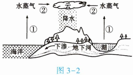 2. (★★)图 3 - 2 是水循环示意图。图中过程①发生的物态变化是____,同时伴随着____热;过程②发生的物态变化是凝华和____,同时伴随着____热。
