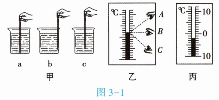 1. (★★)小亮用温度计测烧杯中液体的温度,分别进行了三次操作。如图 3 - 1 甲所示,其中正确的操作是____(填“a”“b”或“c”);温度计读数方法如图 3 - 1 乙所示,其中正确的是____(填“A”“B”或“C”);图 3 - 1 丙中温度计的示数为____℃。