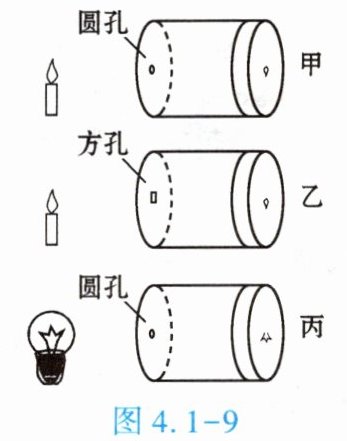 7. (★★★)学习了光学知识后,爱动脑筋的小童和小朵想自己探究小孔成像的现象,如图4.1-9所示,他们给两个空罐的底部中央分别打上一个圆孔和一个方孔,再用两片半透明的塑料膜蒙在空罐的口上,分别将小孔对着烛焰和灯丝,可以看到烛焰和灯丝通过小孔所成的像。