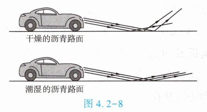 7. (★★★)(双选)如图4.2-8所示是晚上汽车在干燥的沥青路面和潮湿的沥青路面上行驶时大灯部分光路简图,在晚上开车时【 】