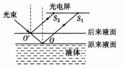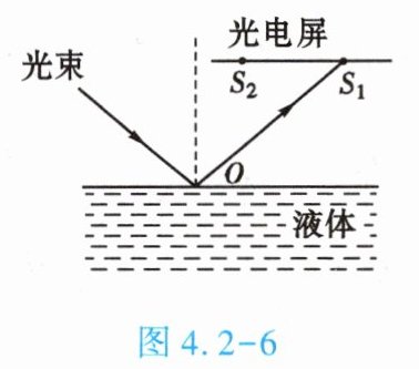 4. (★★★)有一台利用光电原理控制液面高度的仪器,它能将光信号转化为电信号进行处理,其光学部分是这样工作的:通过光束在液面上的反射光打到光电屏上的位置来显示液面高度,如图4.2-6所示,当光电屏上的光点$S_{1}移动到S_{2}$时,表示液面高度______(填“上升”“下降”或“不变”)。根据光的反射定律画出此时液面的位置。
