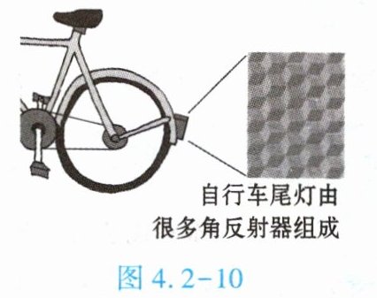 如果在这个偶镜上再加一面镜子,使三面镜子互相垂直;就像从箱子上切下一个角,得到了一个四面体,这就成了角反射器,它实际上是三对偶镜。从任何方向射向角反射器的光线都会被它沿原方向反射回来。自行车的尾灯,从表面上看去好像是蜂窝图案,它里面实际上是许许多多角反射器(如图4.2-10所示)。
