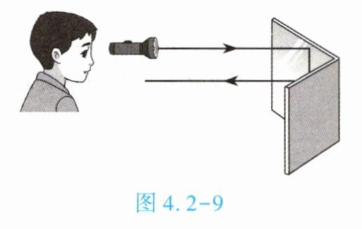 现在拿两面镜子,使它们互成$90^{\circ}$,这样组成一个偶镜,你做一次偶镜的游戏就能揭开自行车尾灯之谜了。把偶镜立在小柜子上,让镜子距地面的高度跟你眼睛的高度相同,拿一个手电筒,如图4.2-9那样让它靠着你的头。打开手电筒,让光线水平入射到偶镜上。看!偶镜上发出炫目的反射光。不管手电筒的光沿什么方向射向镜面,只要使光线保持水平,那么,反射光线就总是逆着原来的方向反射回来。