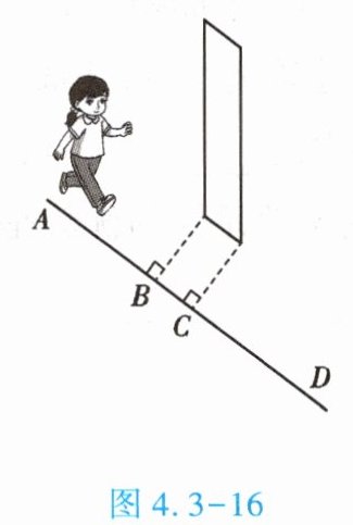 5. (★★)如图4.3-16所示,一块平面镜直立在水平地面上,小华沿与镜面平行的直线从A走到D,从平面镜底边两端点向直线AD所作垂线的交点分别为B、C,则下列说法正确的是【 】
