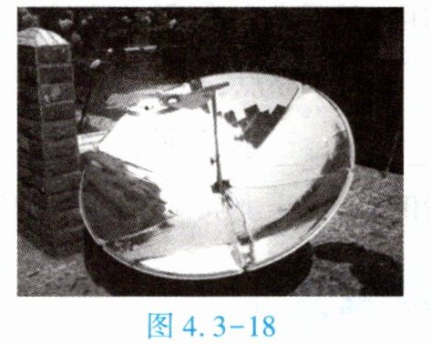 太阳灶(如图4.3-18所示)是利用太阳能辐射,通过聚光获取热量,进行烹饪食物的一种装置。它不烧任何燃料,没有任何污染。
