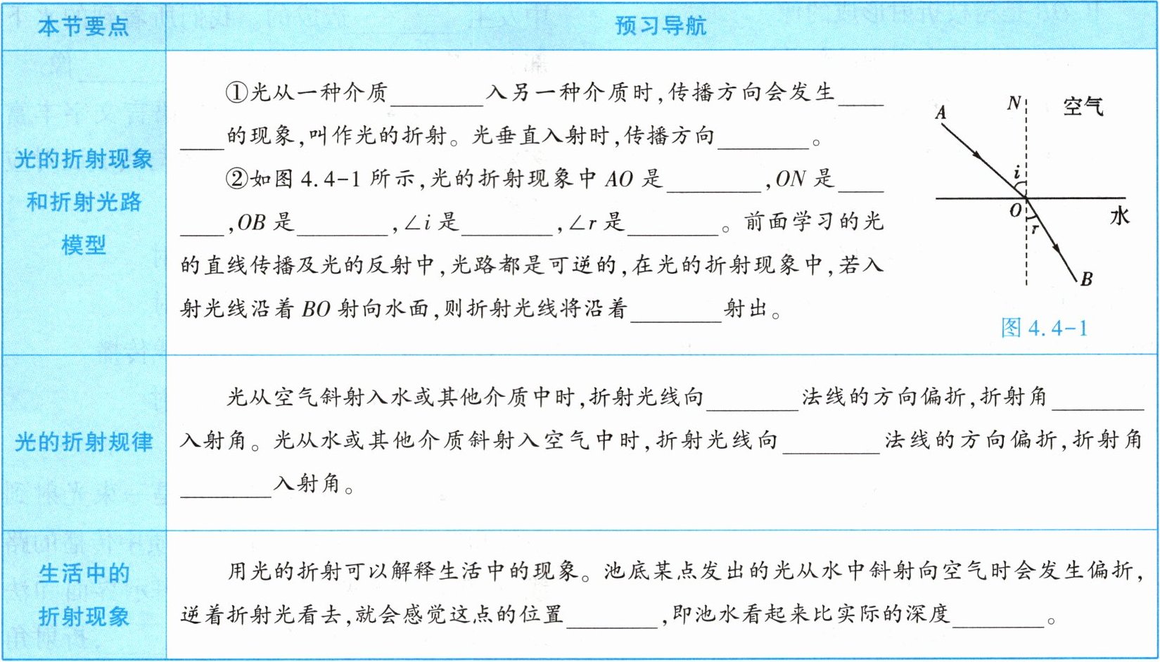|光的折射现象和折射光路模型|①光从一种介质____入另一种介质时,传播方向会发生____的现象,叫作光的折射。光垂直入射时,传播方向____。②如图4.4 - 1所示,光的折射现象中AO是____,ON是____,OB是____,∠i是____,∠r是____。前面学习的光的直线传播及光的反射中,光路都是可逆的,在光的折射现象中,若入射光线沿着BO射向水面,则折射光线将沿着____射出。|