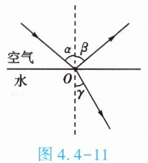 8. 某同学做“探究光的折射特点”的实验。如图4.4 - 11所示是光从空气射入水中的光路。实验中发现,折射光线、入射光线和法线在同一平面内,折射光线和入射光线分别位于法线两侧。通过实验还得到如下数据: