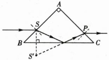 7. (★★★)如图4.4 - 10所示,一玻璃三棱镜的横截面为等腰直角三角形 $ABC$。一束红光平行于 $BC$ 边从 $S$ 点射入三棱镜,经 $AB$ 面折射后,又在 $BC$ 面发生反射,然后恰好从 $P$ 点折射后射出。请画出这个传播过程的光路图。