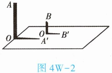 2. ($★★$)如图 4W - 2 所示是两根标杆 $ OA $和 $ OB $及它们在同一点光源下的影子 $ OA' $和 $ OB' $。请在图中画出点光源的位置(用点 $ P $表示)。