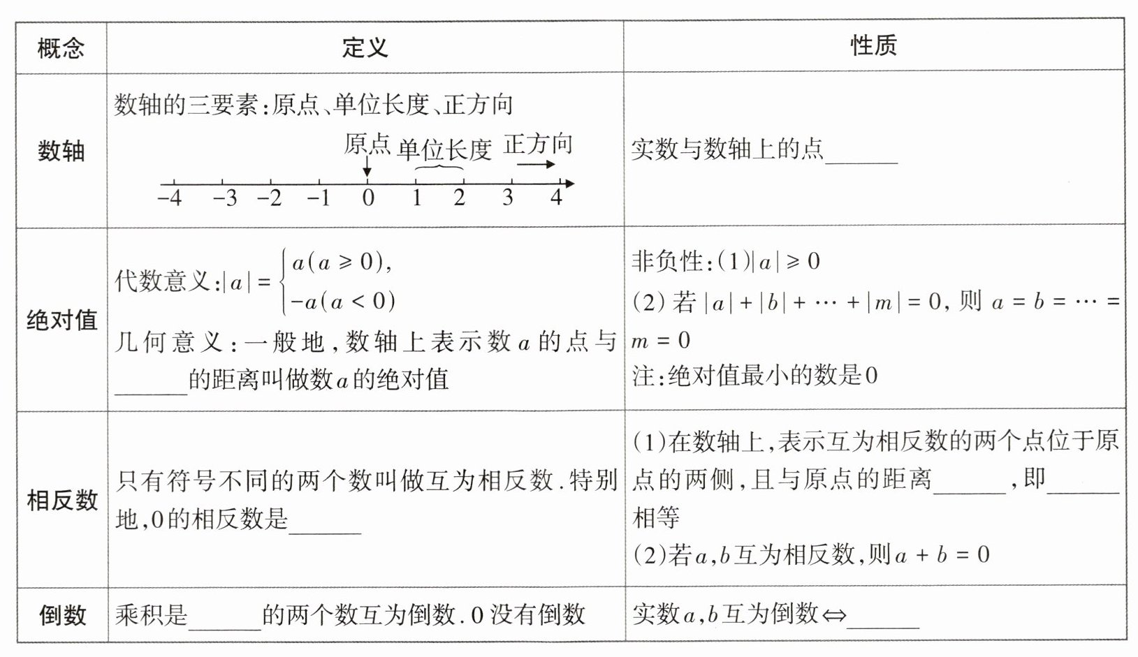 一一对应 原点 0 相等 绝对值 1 \(a\cdot b = 1(a\neq0,b\neq0)\)