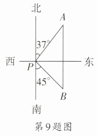 9. 如图,一艘海轮位于灯塔P的北偏东37°方向,距离灯塔100海里的A处,它沿正南方向航行一段时间后,到达位于灯塔P的南偏东45°方向上的B处。此时,B处到A处的距离为____海里。(参考数据:sin 37° ≈ 0.60,cos 37° ≈ 0.80,tan 37° ≈ 0.75)