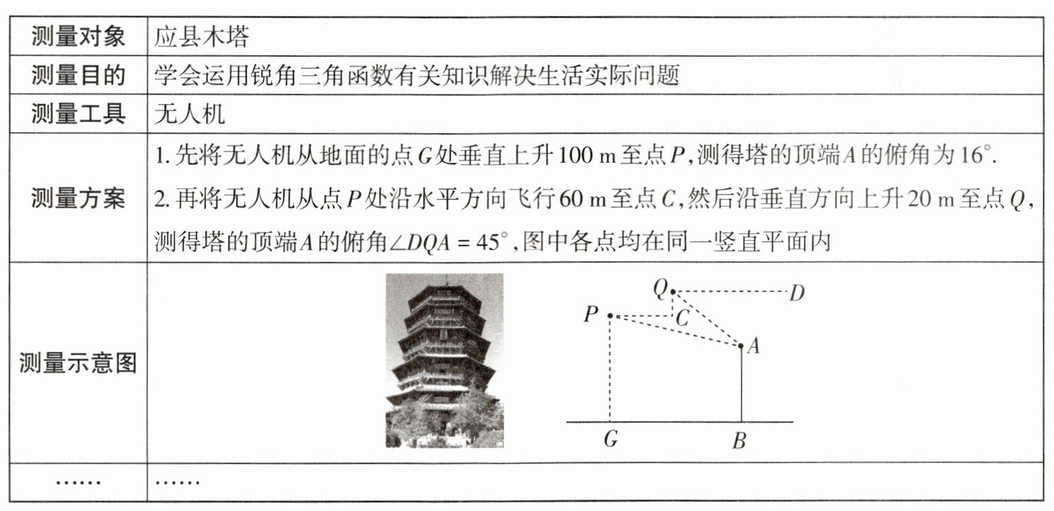 请根据以上测量数据,求应县木塔AB的高度。(结果精确到0.1 m,参考数据:sin 16° ≈ 0.28,cos 16° ≈ 0.96,tan 16° ≈ 0.29)