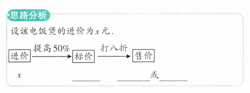 3. (2020山西第17题)2020年5月,太原开展“活力太原·乐购晋阳”消费暖心活动,本次活动中的家电消费券单笔交易满600元立减128元(每次只能使用一张)。某品牌电饭煲按进价提高50%后标价,若按标价的八折销售,某顾客购买该电饭煲时,使用一张家电消费券后,又付现金568元。求该电饭煲的进价。